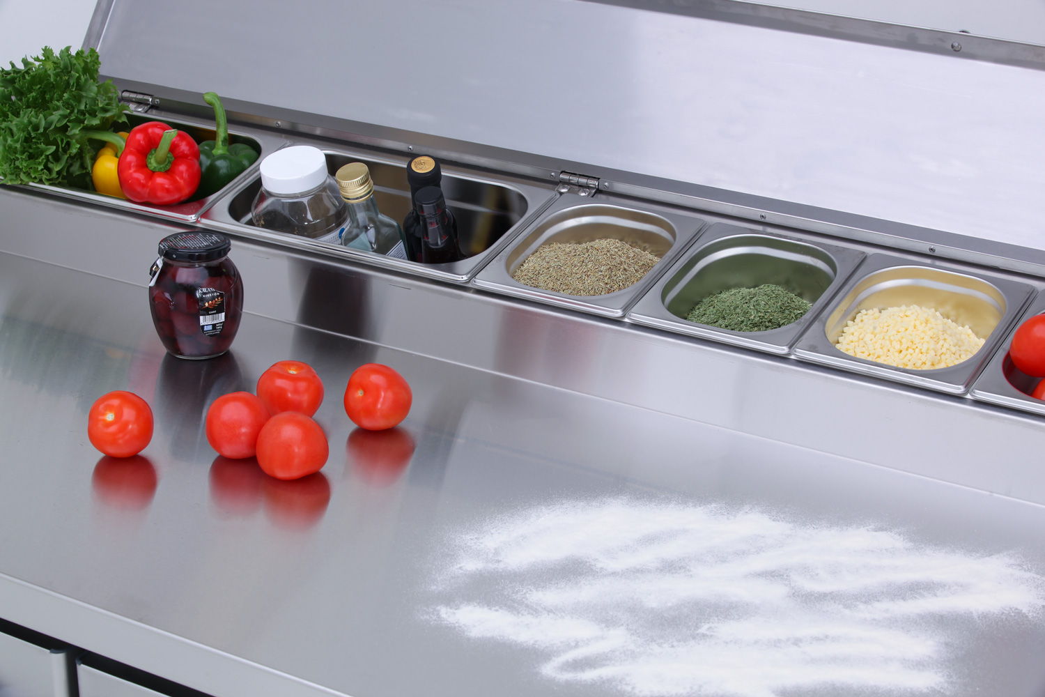 – pizza table with heightened cold basin and cold drawers